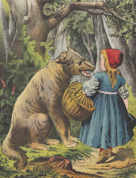 Little Red Riding Hood, a German fairy tale by the Brothers Grimm. Colour lithograph from the book «Deutsches Märchenbuch (German Storybook)», published by J.F. Schreiber, Eßlingen in 1875.