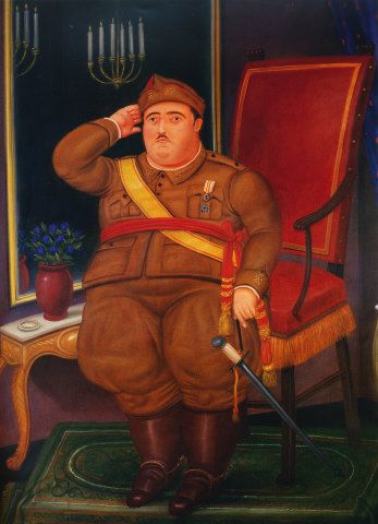 Esta burla a lo establecido se redobló frente a lo solemne. Algunos tratan de ver en Botero la justa reivindicación de ciertas causas sociales o el amago de un corpus político en sus gordas trazadas, pero en Botero sólo hay boterismo, que es la forma más sublime de desenfado. Así, encontramos entre sus obras una ancha caricatura de Franco (8), engalanado con su uniforme militar (y que hoy conserva el Museo Reina Sofía como única pieza del pintor); o un retrato del narcotraficante Pablo Escobar (9), agujerado por las balas tras una persecución −algunos problemas le causó esa estampa de un sangriento Escobar yaciendo en el suelo−.