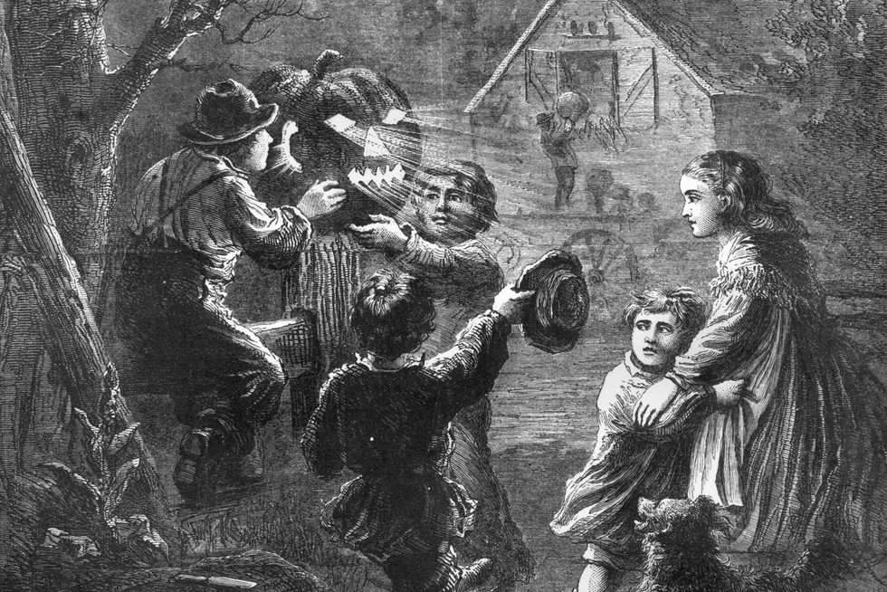 circa 1867: Magazine illustration of a group of children putting an illuminated Jack-o- Lantern on a farm fence post on Halloween night. Engraving titled ‘The Pumpkin Effigy’. (Photo by American Stock/Getty Images)